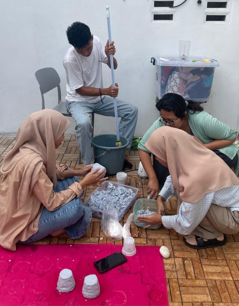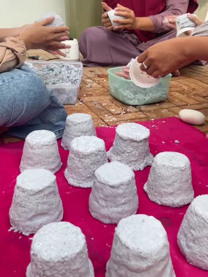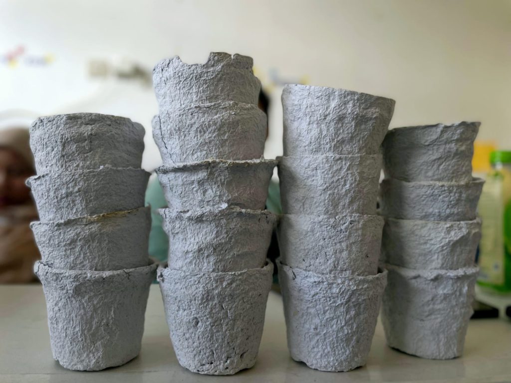 The paper pulp is shaped using a simple mold, such as an old pot, and left to dry under sunlight until fully hardened. Once dry, the pot is ready for use or can be decorated creatively by the participants. These pots are biodegradable, allowing seedlings to be planted directly in the soil without disturbing their roots during transplanting.